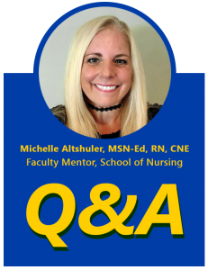 To further understand the impact of the Coronavirus on the nursing field, I got in touch with the School of Nursing’s faculty mentor, Michelle Altshuler, MSN-Ed, RN, CNE, to share her thoughts and perspective as an active certified nurse educator.
